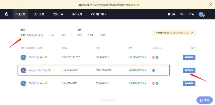 1、选择比特币BTC,考虑价格、支付方式选择广告,点击“购买BTC”。