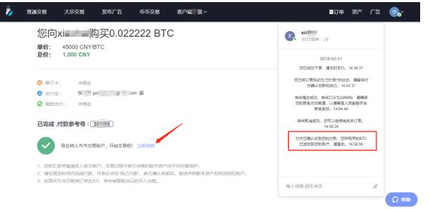 6、卖方放币后,交易成功。 您可以点击“立即划转”,将数字货币划转至币币交易账户; 也可以在右上角“资产”中,看到刚购买的数字货币。