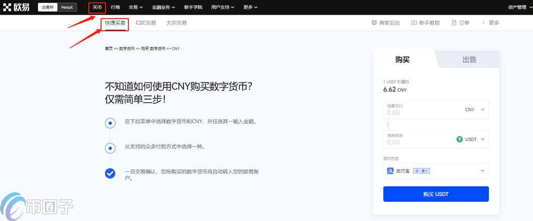 4、在欧易点击红框圈出的按钮买币,再点击快捷买卖即可进行快捷买币