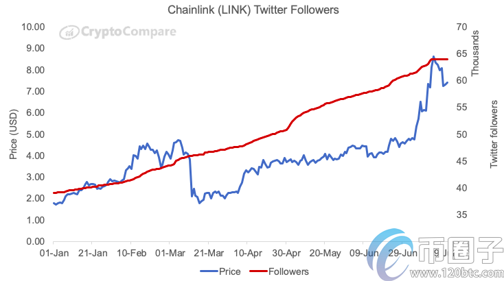 其实爱交朋友的Chainlink不仅圈内好友众多,社区拥簇也随币价水涨船高。数据分析商CryptoCompare表示,Chainlink社交媒体追随者不断飙升至新高。CryptoCompare的研究人员直言:“ LINK是2020年表现最好的山寨币之一,随着它的影响力越来越大,它的社交媒体追随者也在同步增长。”