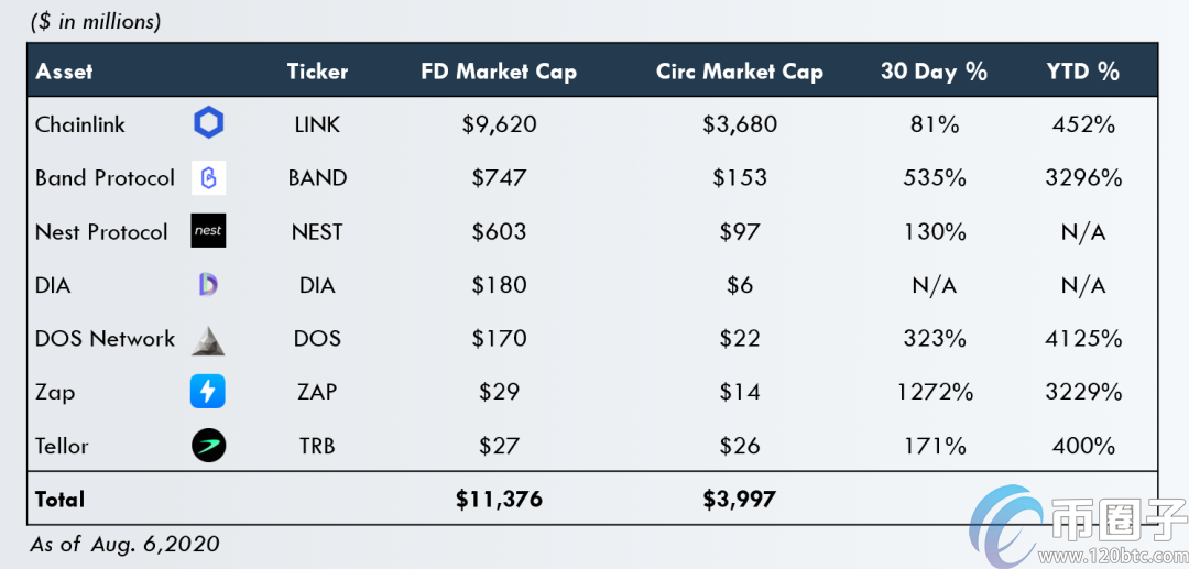 近日数据分析商Messari发布的一份新报告也表示,Oracle(预言机)类项目代币在今年大受欢迎,是2020年表现最好的加密资产之一,其中Chainlink (LINK)、Band和Nest等Oracle代币今年实现大幅上涨。迄今为止Chainlink已上涨了400%,而Band、Dos Network和Zap等代币在过去一年里上涨了3000%到4000%。