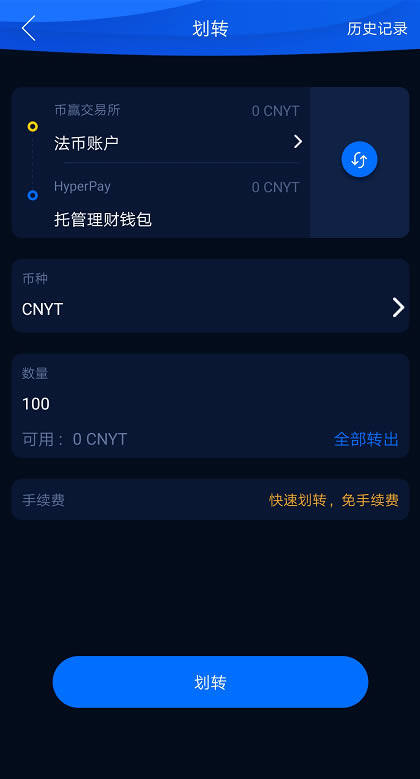 6、将法币账户中已买入的数字货币,划转到托管理财账户中,就能开始使用数字货币了。