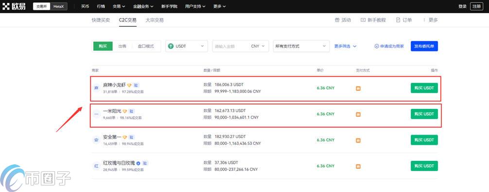 5.在【C2C交易】(单笔交易额在10万元以上的可以选择大宗交易)中选择合适的委托单,点击购买。