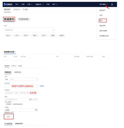 1. 点击页面右上方资产管理,选择提币,可以选择普通提币或内部转账,选择想要提币的币种后进入提币界面,输入提币地址和提币数量,点击提交。