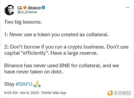 11月9日消息,CZ 在其社交平台表示,从此次 FTX 事件中可以得到两个教训:1. 不要使用自己创建的 Token 作为抵押品。2. 如果你经营加密货币业务,请不要借贷。不要有效地使用资本。要保证大量的储备金。