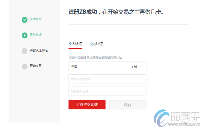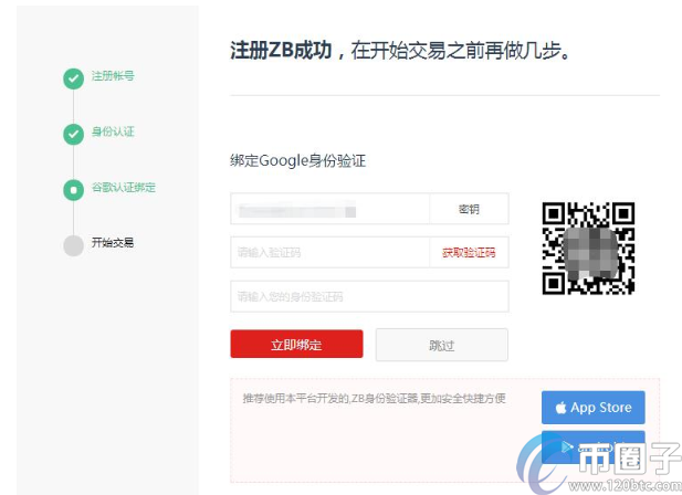 2、注册ZB成功后,可以根据引导完成身份认证、Google认证绑定,并且开始交易。(也可以选择“跳过”,后续自行操作)