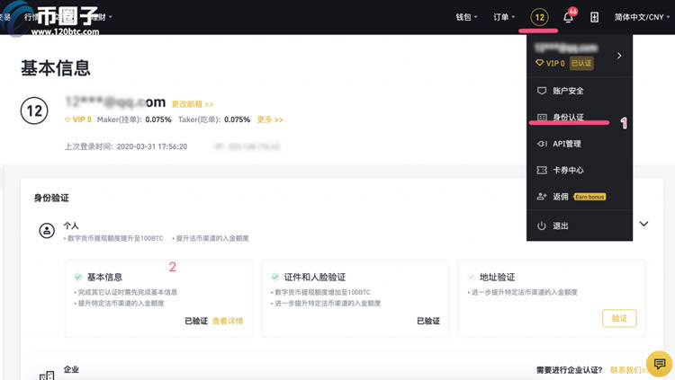 如上图所示操作,鼠标悬浮在头像处,然后点击”身份认证“后,在身份认证页面完成你的基本信息认证。