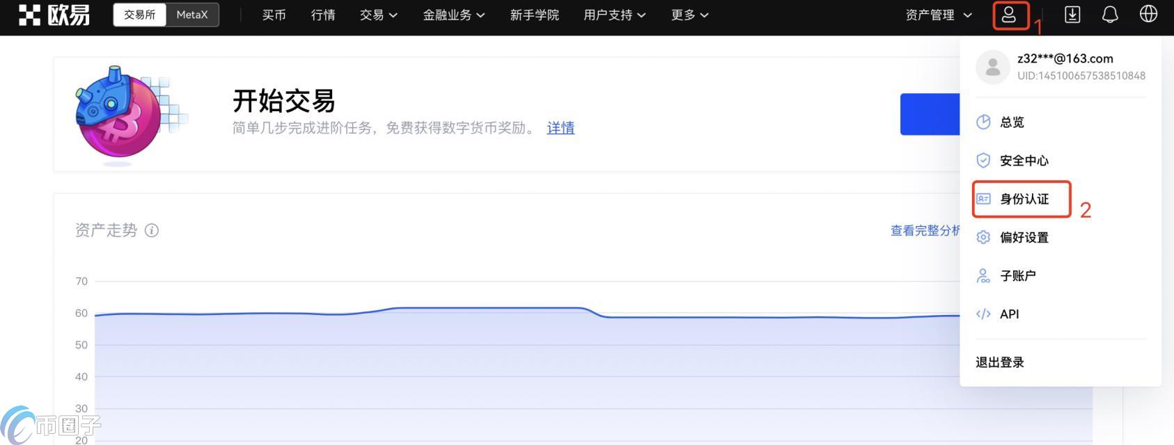 KYC身份认证:打开欧易官网,在页面右上角点击【个人中心】—【身份认证】,进入身份认证页面,按照页面提示完成LV.1基础认证、LV.2高级认证和LV.3视频认证。