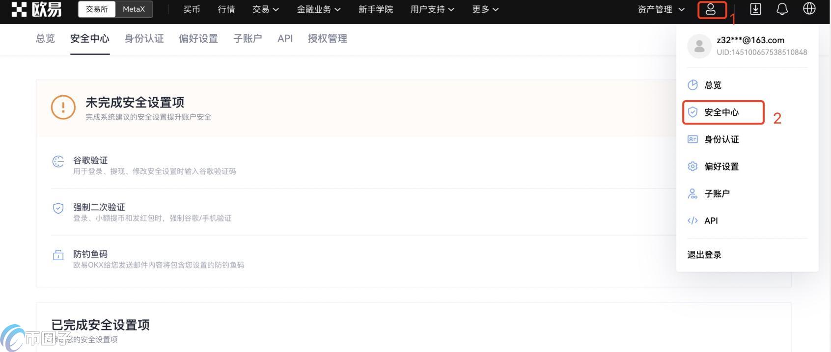 安全设置:打开欧易官网,在页面右上角点击【个人中心】—【安全中心】,即可进入安全设置页面,您可以在此页面进行登录密码和资金密码的修改以及邮箱验证、谷歌验证、防钓鱼码等设置,个人信息设置的越完善,越能够保障您的交易和账户安全。