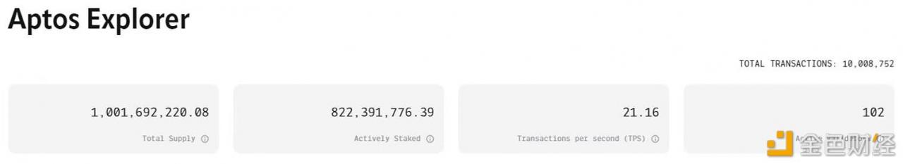 据Aptos Labs最新数据显示,Aptos链上交易量已突破1000万笔,本文撰写时达10,008,752笔,活跃质押量为822,391,776.39枚APT,活跃验证者102个。另据Coingecko数据显示,当前Aptos(APT)约为9.71美元,24小时涨幅8.5%,市值已达到1,265,961,265美元。