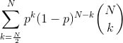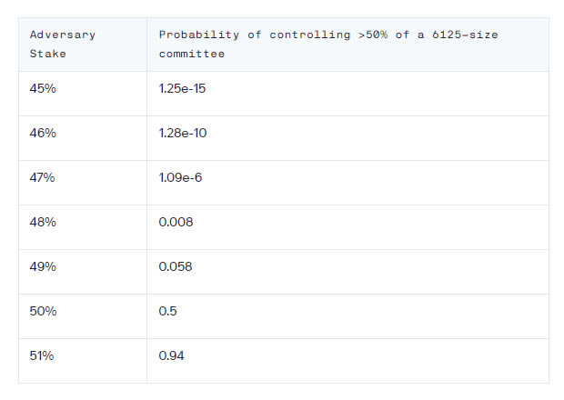 更正式地说,拥有 p %股权的恶意行为者控制 N 个验证人规模的委员会中超过 50 %的概率遵循二项分布(其中 k = N/2 )。
