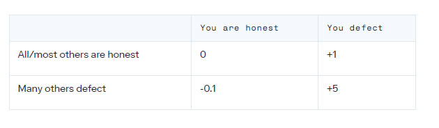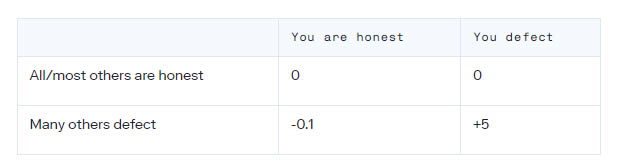 我们可以用一个回报矩阵来通俗地描述每种情况,其中 "缺陷 "意味着 "下载并使用执行反欺诈的软件"。报酬是 "短视 "的,没有考虑到长期后果。