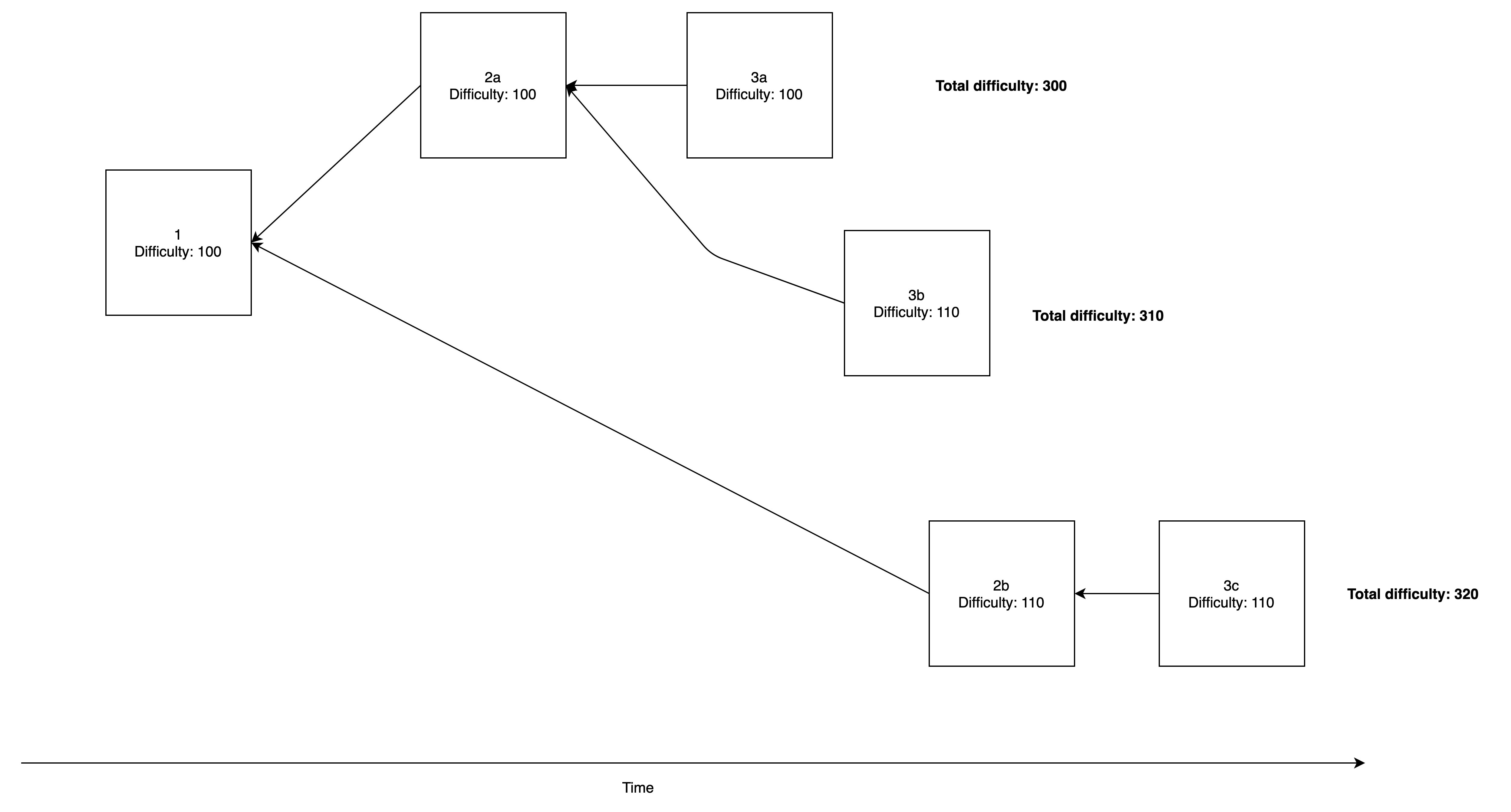 2.区块 2a 和 3a 分别以 100 的难度到达,我们将它们插入我们的链中,形成一个总难度为 300 的分叉。