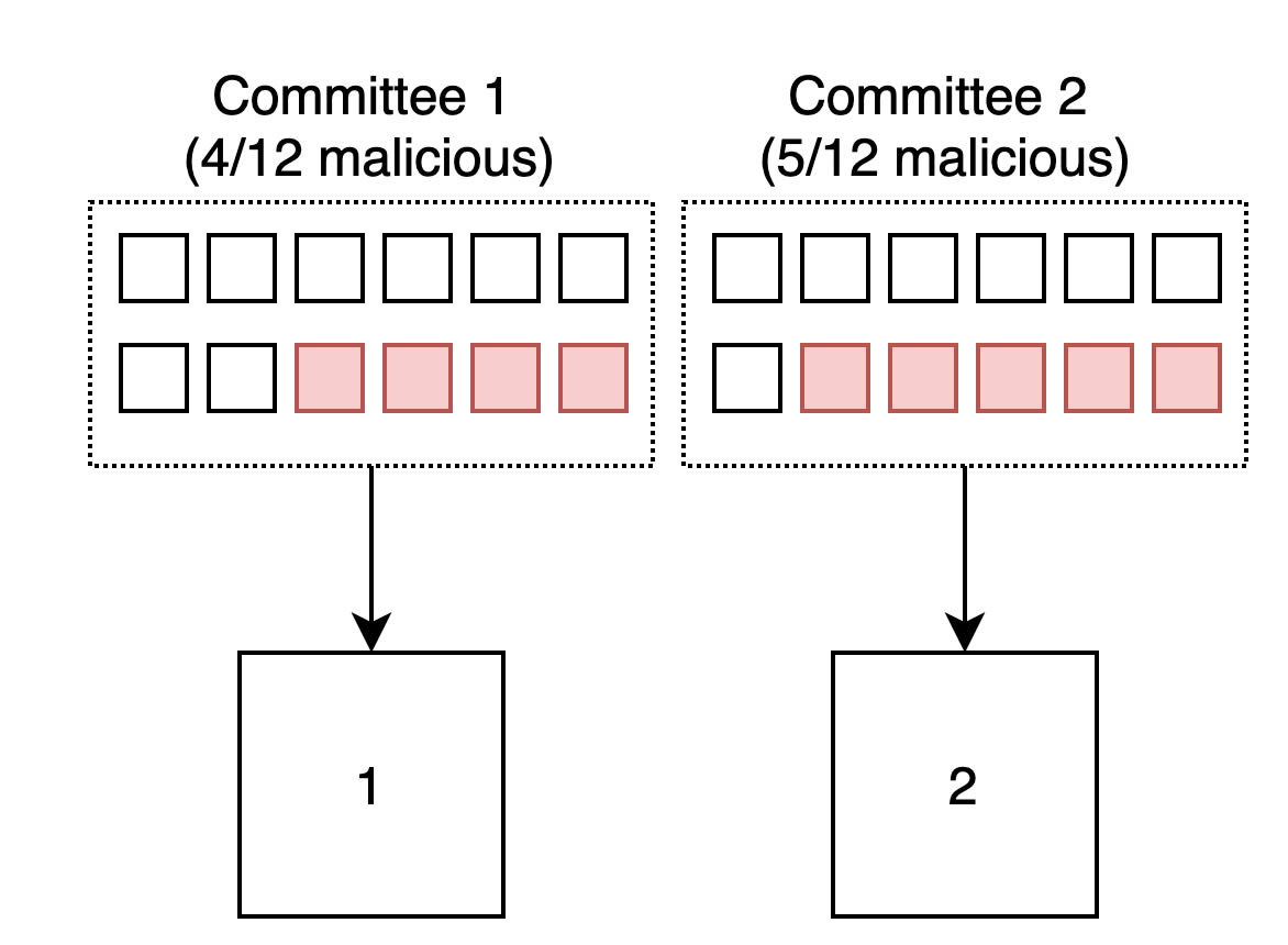 为了获得一些关于为什么会这样的直觉,让我们看一个有 2 个插槽和 24 个验证者的例子,其中 9 个是恶意的。验证者被分成两个委员会,由于随机洗牌,对手不太可能控制他们被分配到的任何一个小组的 50 %以上,并导致重组。