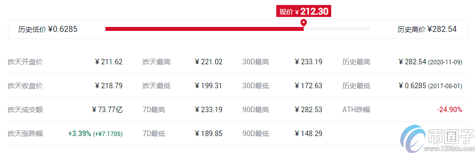 莱特币市值70.03亿美元,占全球总市值的1.13%,流通总量6399.7万,24小时成交额76.57亿美元,上架了287交易所。