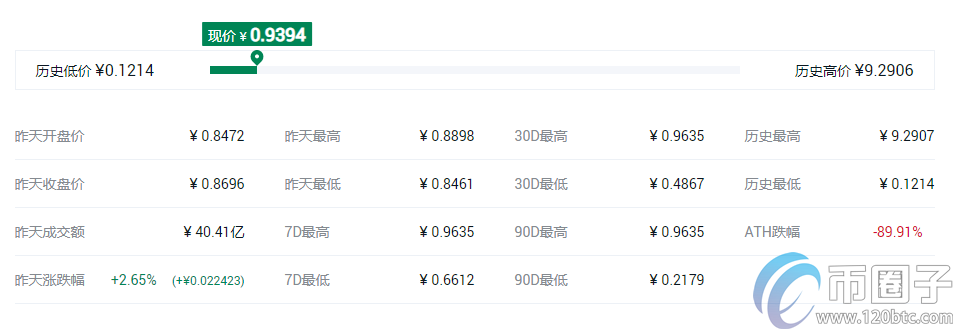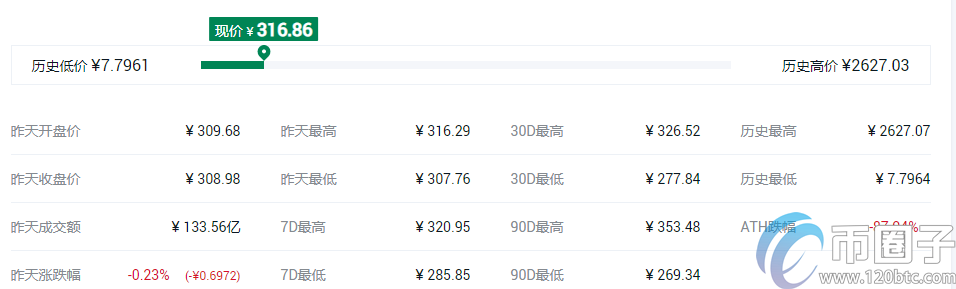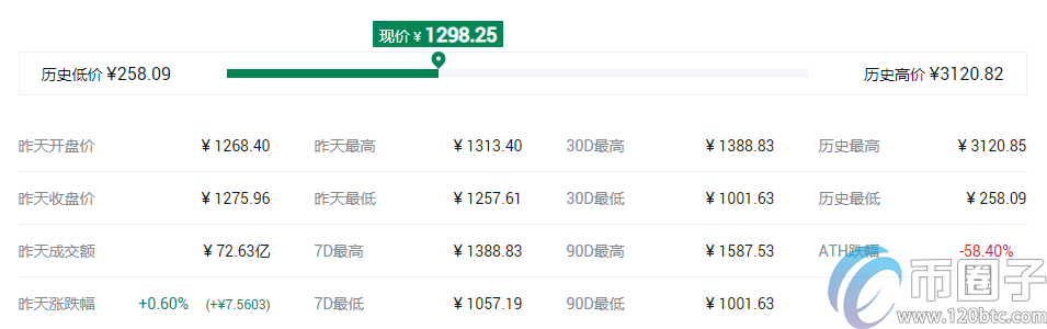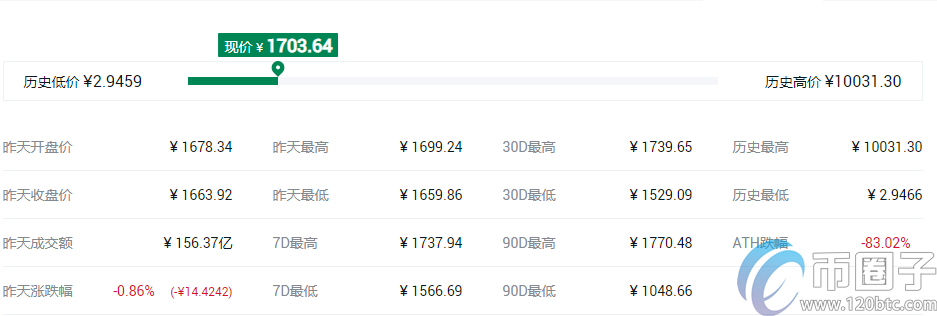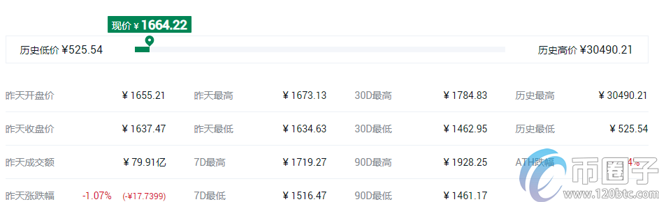 以太坊市值271.71亿美元,占全球总市值的9.15%,流通总量1.11亿,24小时成交额29.58亿美元,上架了332交易所。