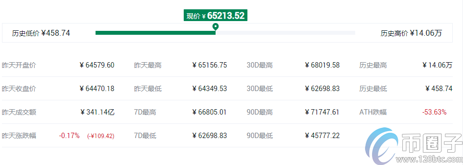 比特币市值1716.26亿美元,占全球总市值57.79%,流通数量1824.75万,24小时成交额63.97亿美元,上架了327家交易所。