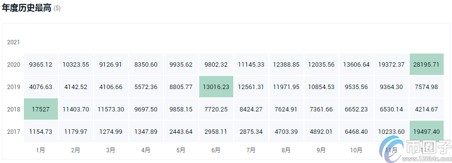 6.2021年(截止1月19日)开盘价最高36945.57美元;