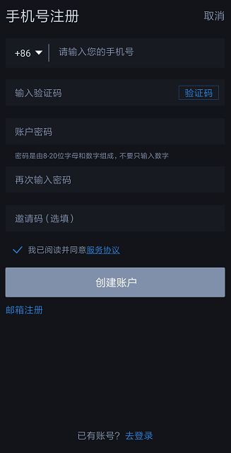 4、按照页面要求输入账号(手机号或邮箱)、验证码、密码、邀请码(无邀请码可不填),核对无误后阅读服务协议,同意并勾选,点击【创建账号】按钮提交注册信息。