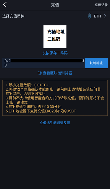 2、在APP充值页面中,选择需要充值的币种,详细阅读充值注意事项。复制系统分配的充值地址或使用钱包直接扫描地址二维码,向此充值地址中转入您需要充值的币种即可。