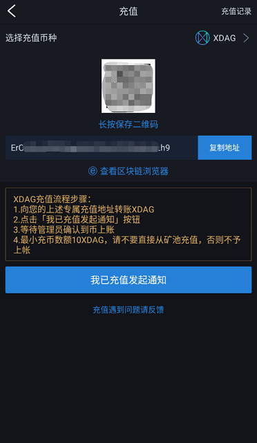 3、对于部分特殊币种(例如:XDAG和LTK)需要完成充值转账交易后,再次点击充值页面的“我已充值发起通知”后,系统开始进行入账操作。