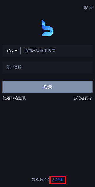 3、未注册用户,请点击【登录】页面最下方“去创建”注册BBX账户。