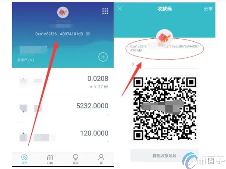 3、一般从交易所提币都是提现到钱包中,所以提币地址就填写自己的钱包地址。钱包地址在使用的钱包中可以查看,以imtoken钱包为例,打开钱包,点击【资产】在最上方有一个数字 英文的组合,这个就是你的钱包地址