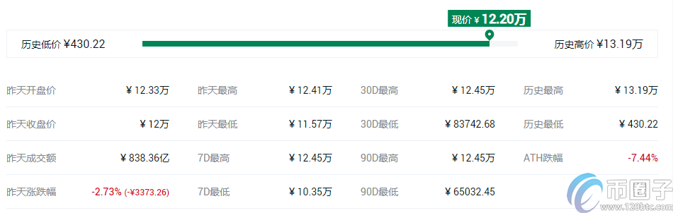 BTC比特币截止发稿之前价格是18582.71美元,也就是说1个比特币价格是人民币12.2万元,24小时最高价人民币12.26万元,24小时最低价人民币11.57万元,24小时成交额是人民币835.50亿元。