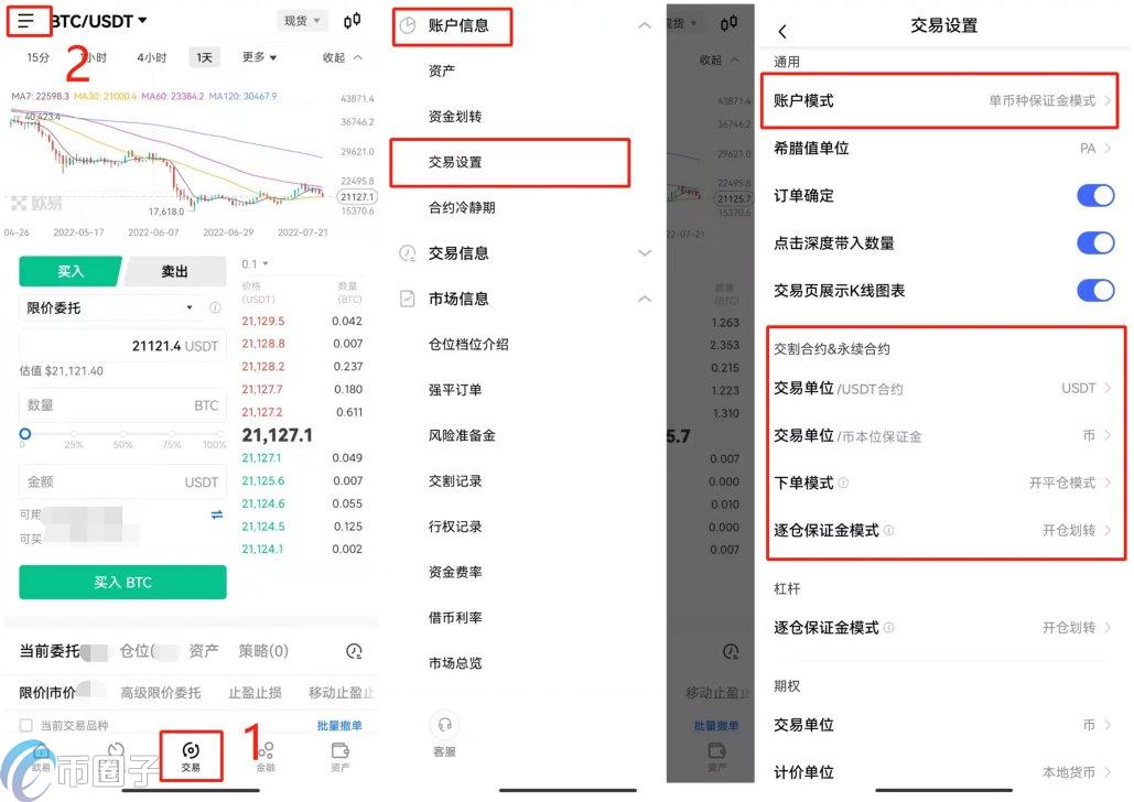 1)想要进行合约交易需要将账户模式开通并设置为单币种保证金模式或跨币种保证金模式。