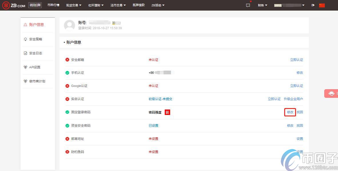 (1)打开ZB官方网站登录账户,在“账户信息”页面。选择“固定登录密码”中的“修改”。
