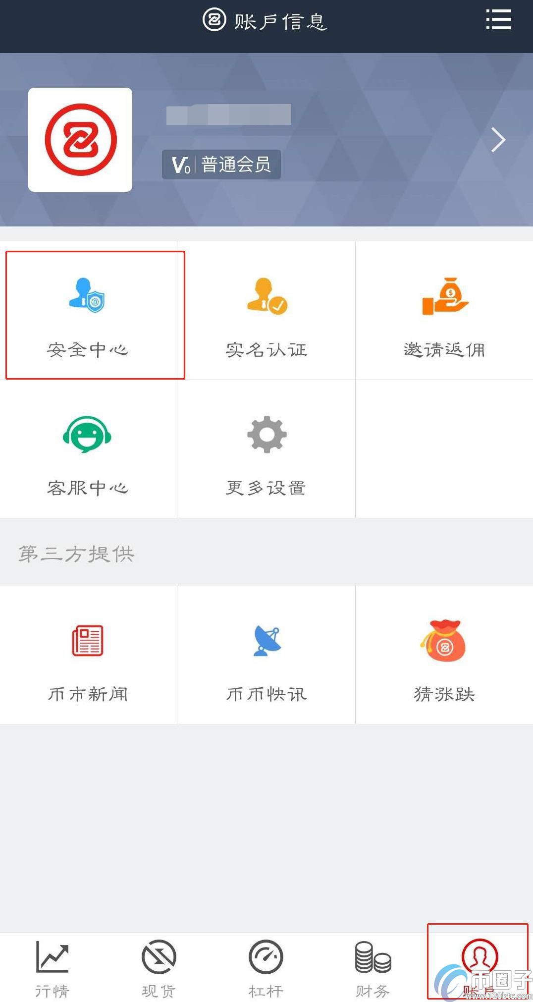 1、打开ZB官方APP,登录账户,点击【账户】中的 “安全中心”。