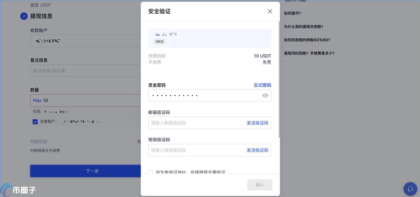 2.内部转账:打开官网,点击右上角【资产管理】—【提现】—选择币种【USDT】—选择【内部转账】—【下一步】;输入【收款账户】—【数量】—【下一步】—按要求获取并输入相关密码/验证码—【确认】,完成操作。