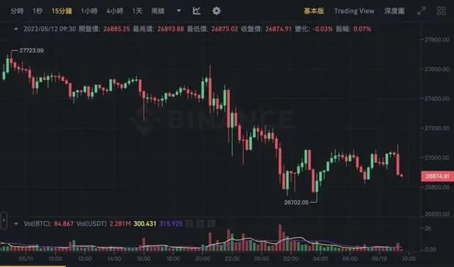 比特币昨晚持续在27,500 美元附近震荡多时候,于晚间08:30 左右开始下跌,今(12)晨最低跌至26,702 美元,截稿前多次挑战站回2.7 万美元都以失败告终、现报26,874 美元,近24 小时2.26 %。
