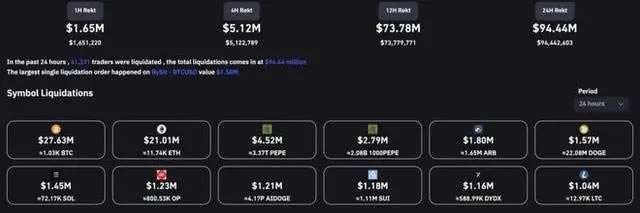 震荡下跌的行情,据Coinglass数据显示,过去24 小时内,有近4.1 万人遭清算,全网爆仓金额达9,444 万美元。其中,比特币爆仓额最大,达2,763 万美元,以太币爆仓额名列第二,达2,101 万美元。