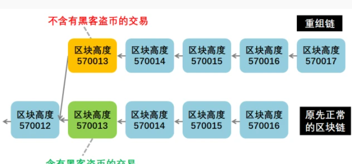 依靠算力优势,可让重组后的区块链最后成为最长的合法链。