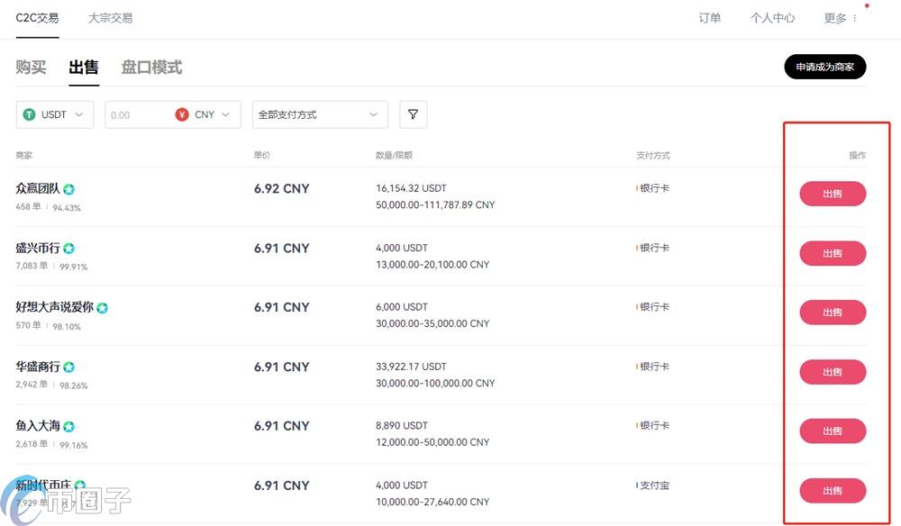 8.点击“出售”,可以看到右侧USDT单价,根据需求选择经验商家,点击“出售USDT”。