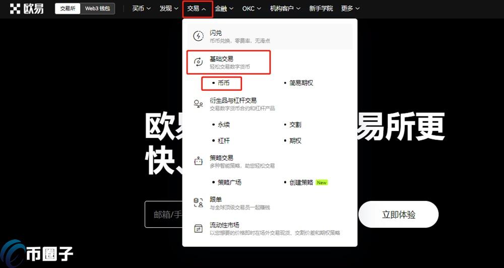4、登陆完回到首页,点击交易—基础交易—币币,进入交易页面。