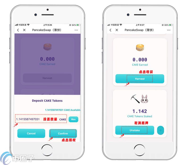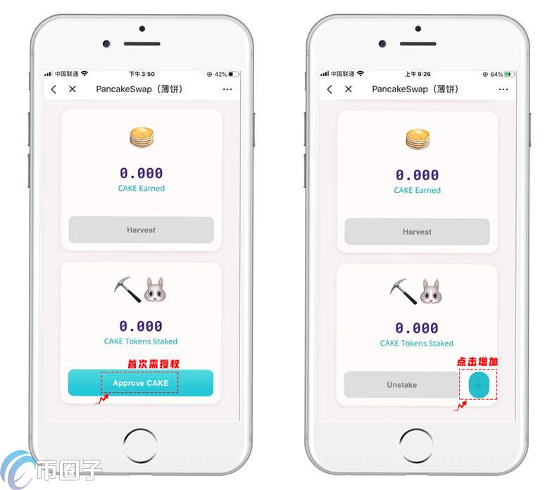 1.1 CAKE = 1 SYRUP,抵押CAKE(薄饼代币)可以获得SYRUP,持有SYRUP不仅可以获得CAKE奖励,还将用于后续的薄饼交换彩票和一般治理等功能。首次操作需要授权【Approve CAKE】,授权完成后点击加号即可添加CAKE代币。