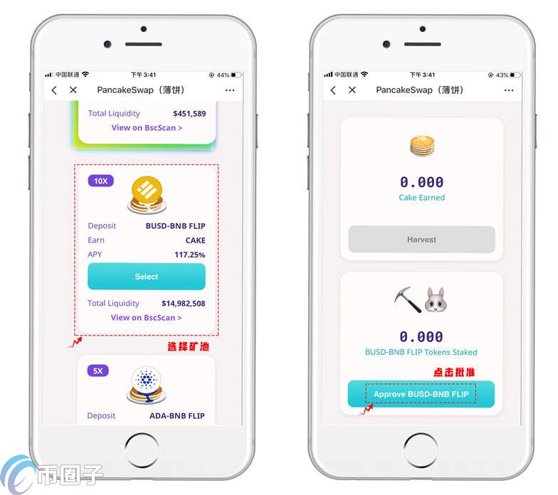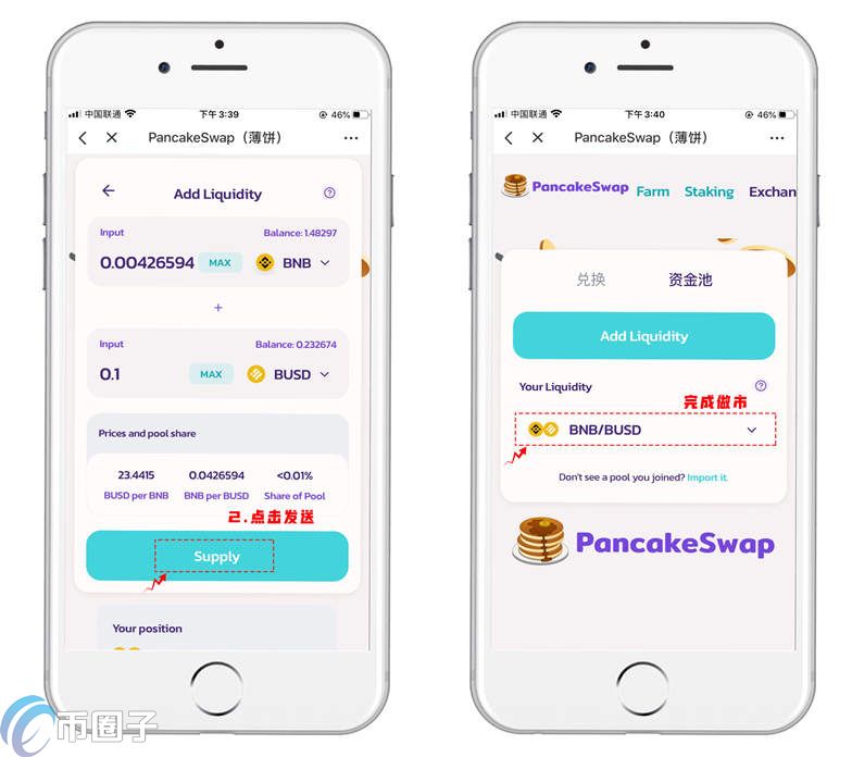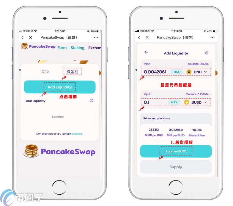 1.抵押挖矿使用了LP抵押凭证挖矿的模式,所以我们需要先把支持的做市代币对加入资金池。点击【资金池】点击【Add Liquidity】选择BNB/BUSD(事例),设置好数量后点击【Approve BUSD】进行首次操作授权。