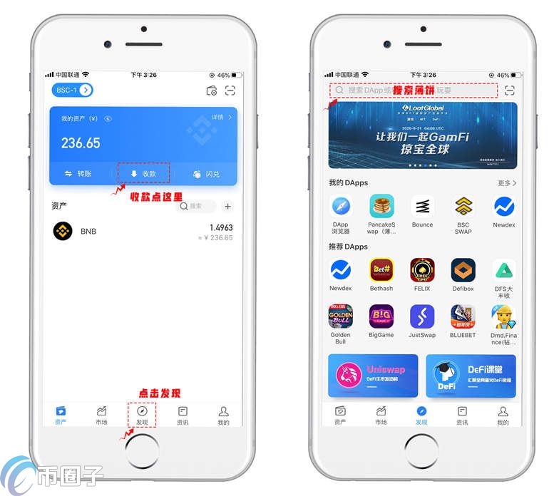 1.打开TP(TokenPocket)钱包,点击【发现】顶部搜索【薄饼】即可找到并打开DApp。