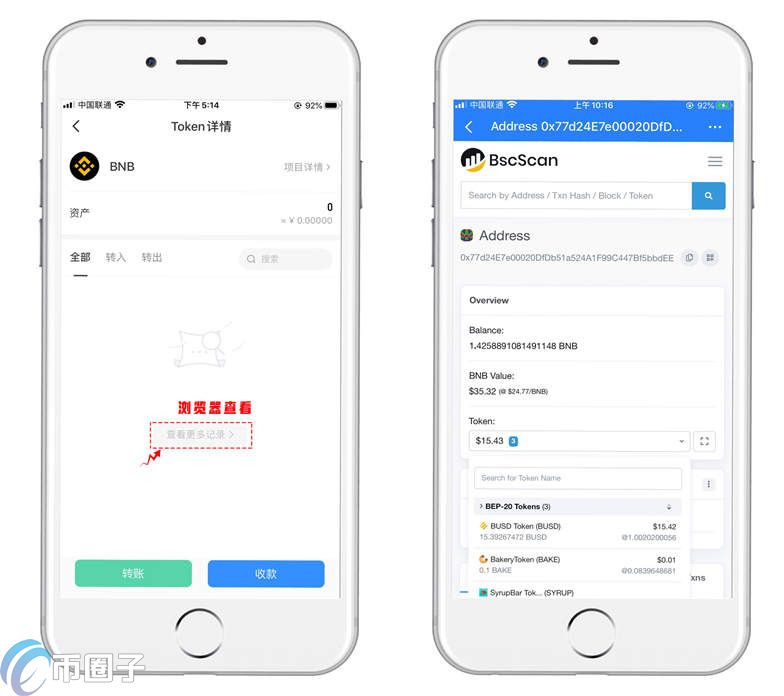 4.币安智能链的代币交易记录暂时还不能显示,近期版本会更新支持;可以点击代币交易记录里面的【查看更多记录】来通过区块浏览器查询。浏览器查询链接