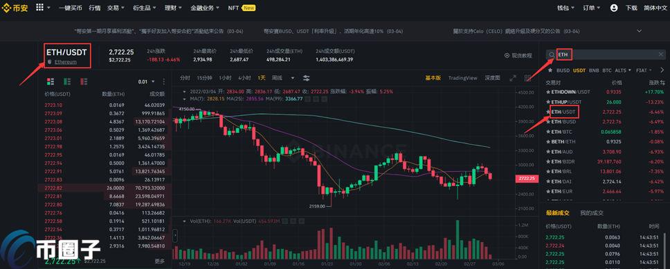 5、点击行情进入币种页面,搜索以太坊英文简称ETH。