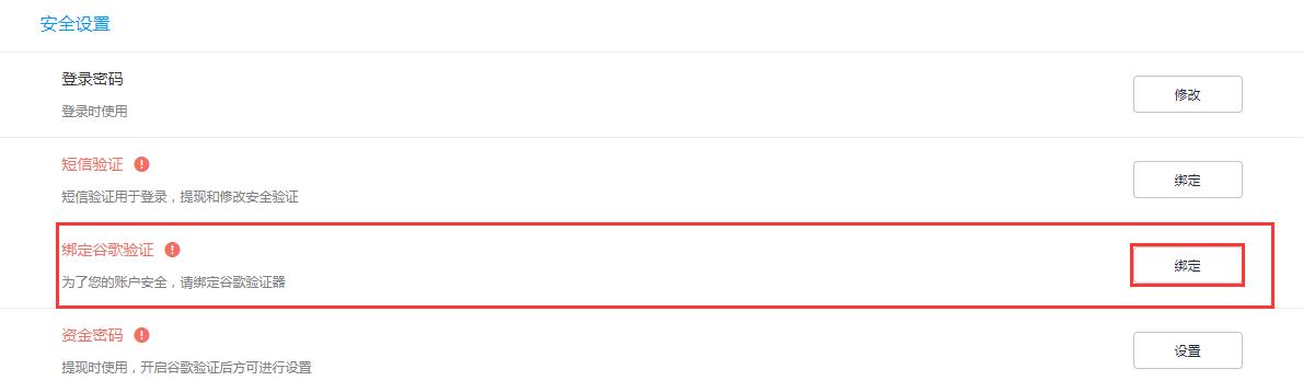 5、登陆后,点击页面右上方账户信息按钮,在安全设置中找到绑定谷歌验证,点击“绑定“。