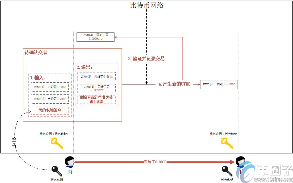 交易的输出是未确认的UTXO(3):丙给丁0.8BTC,这个新的UTXO指向丁的钱包公钥,待交易确认后,将被丁的钱包公钥锁定。此时还有0.4BTC需要找零给丙,因此还需要输出一个未确认的UTXO(4): 丙给丙0.3999BTC,这个新的UTXO指向丙的钱包公钥,待交易确认后,将被丙的钱包公钥锁定。为什么找零的数额不是0.4BTC呢?因为比特币网络要求,交易转账,需要向比特币网络支付交易手续费。剩余0.0001BTC未指向任何钱包公钥,将作为转账手续费支付给打包这笔交易的矿工(如果未找零,剩余所有未指定的比特币将全部作为手续费给打包交易的矿工,不过目前找零工作都由钱包自动完成,不用担心)。
