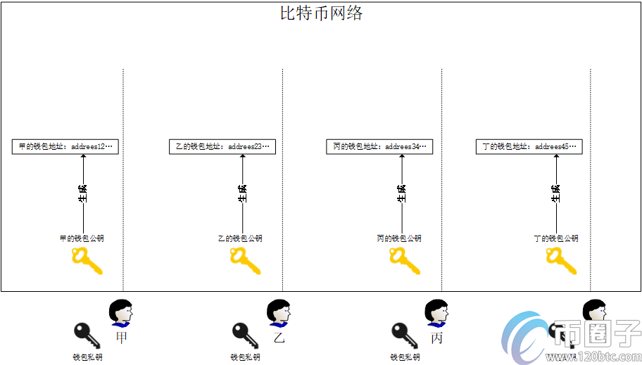 如下图,有甲、乙、丙、丁四个人,他们都有比特币钱包,钱包私钥自己持有,钱包地址(由各自钱包公钥生成)在比特币网络公开,用于UTXO的锁定和验证。