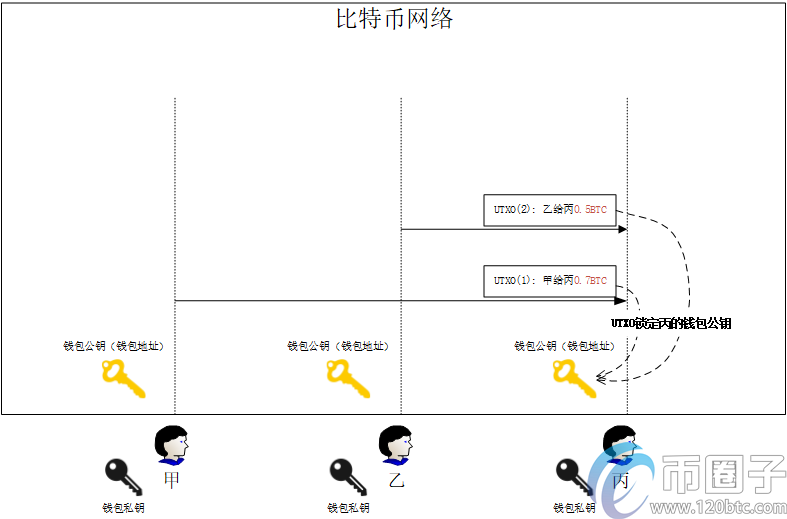 起始,甲给丙0.7BTC,在比特币网络里的记录是UTXO(1):甲给丙0.7BTC;乙给丙0.5BTC,在比特币网络里的记录是UTXO(2):乙给丙0.5BTC。此时,丙的比特币钱包的账户余额为这两个UTXO之和,丙的比特币总数=UTXO(1) UTXO(2)=1.2BTC。如下图: