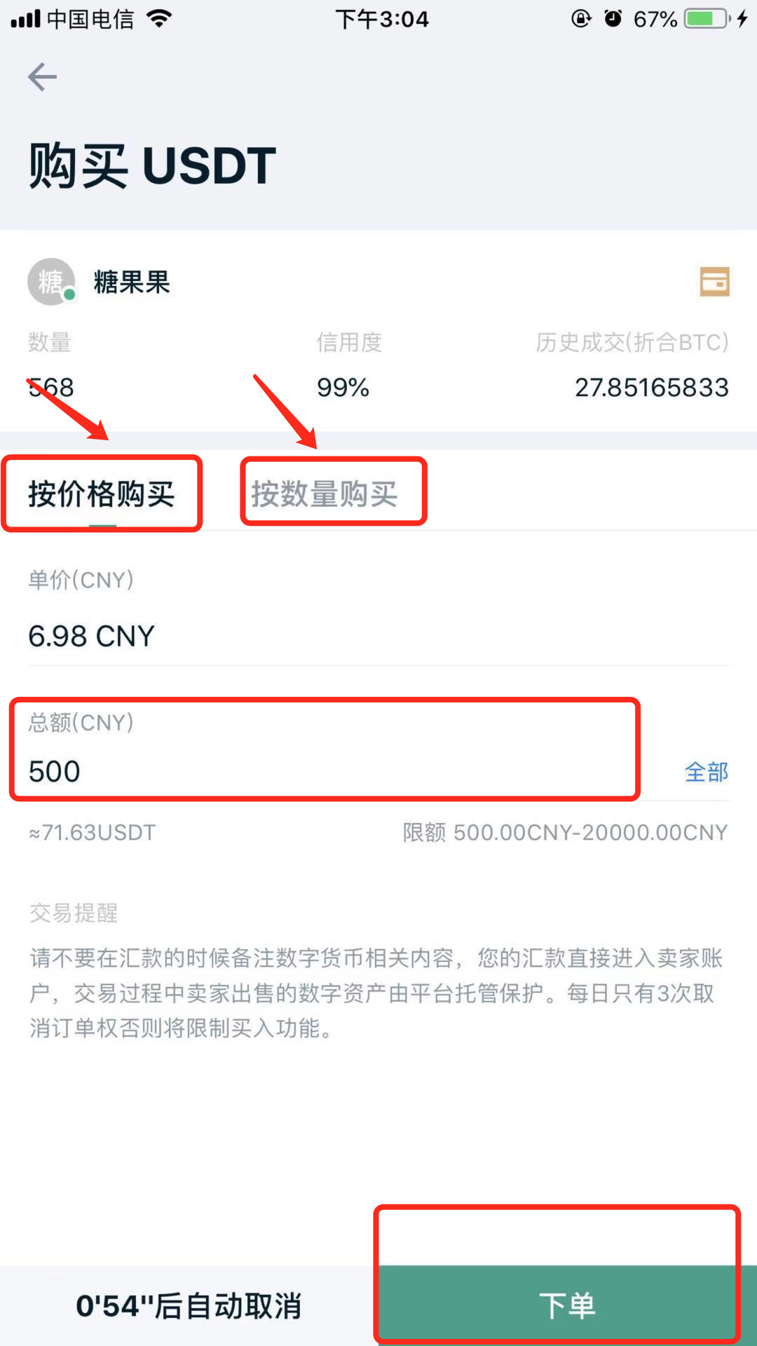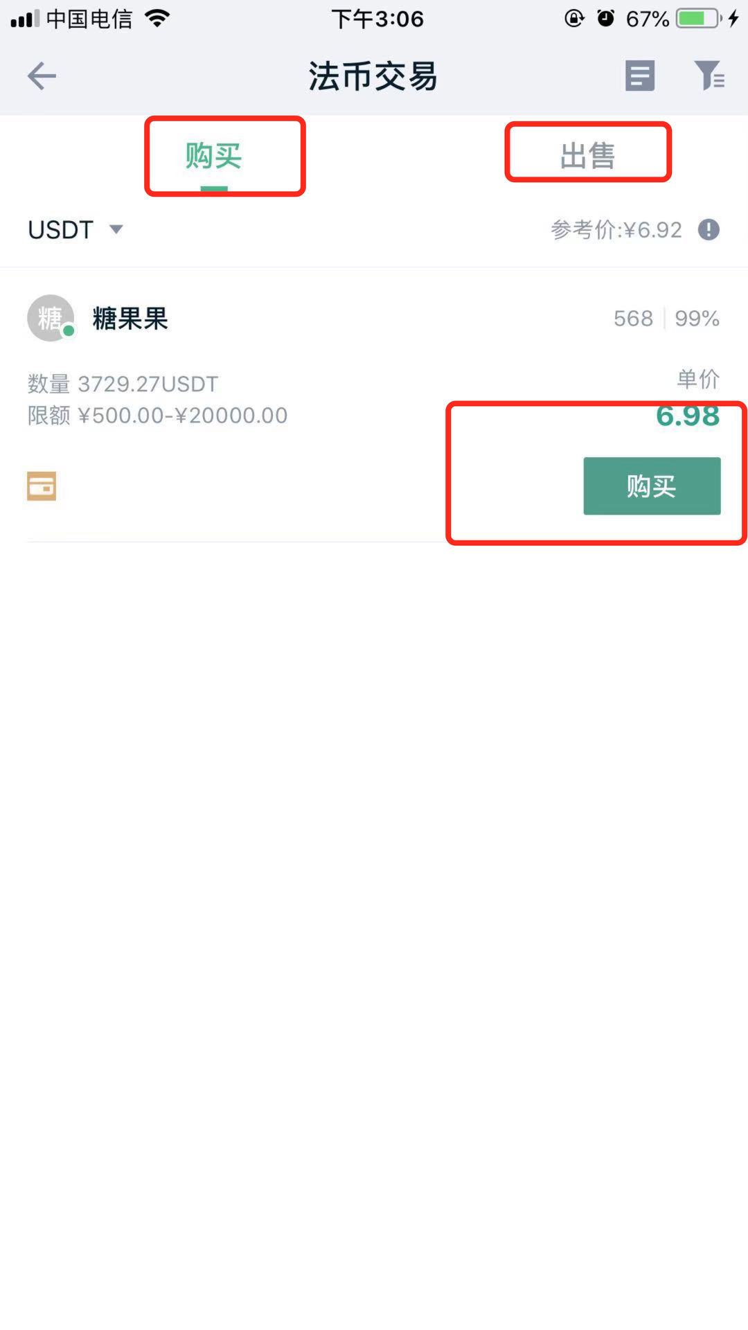 第三步:点击购买/出售,点击“购买/出售”输入您需买入/卖出的USDT数量。
