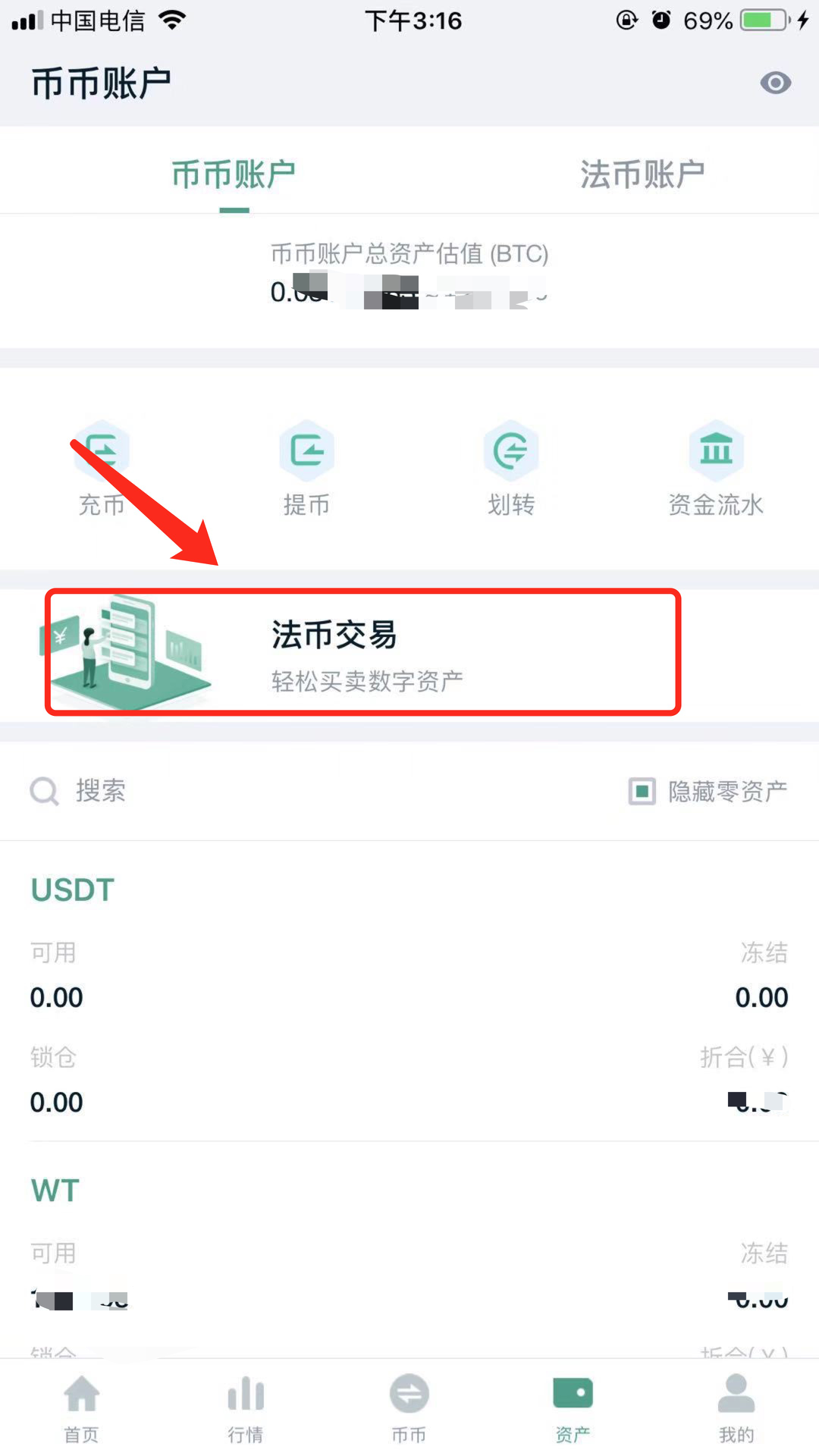 购买USDT成功后,需要把法币账户划转到币币账户进行交易)。