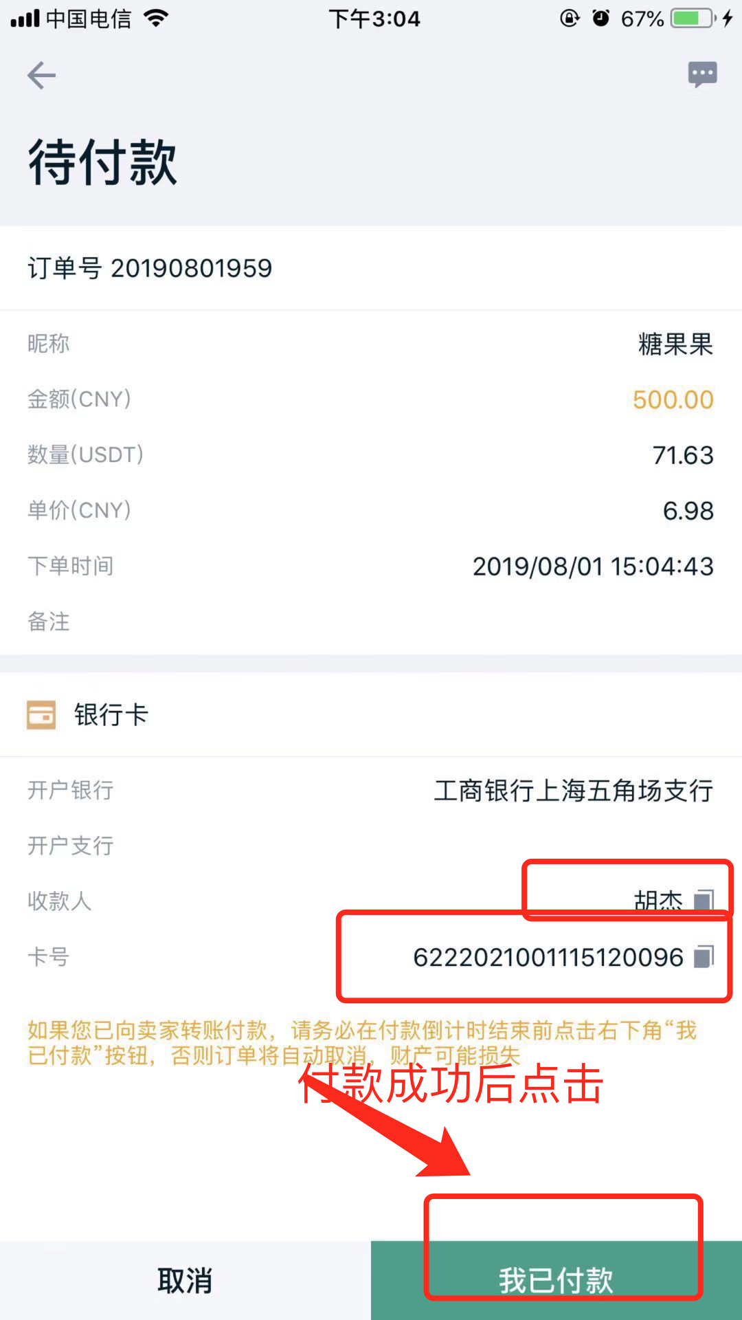 第四步:买币需要在15分钟内进行付款。支付成功点击“我已付款”。
