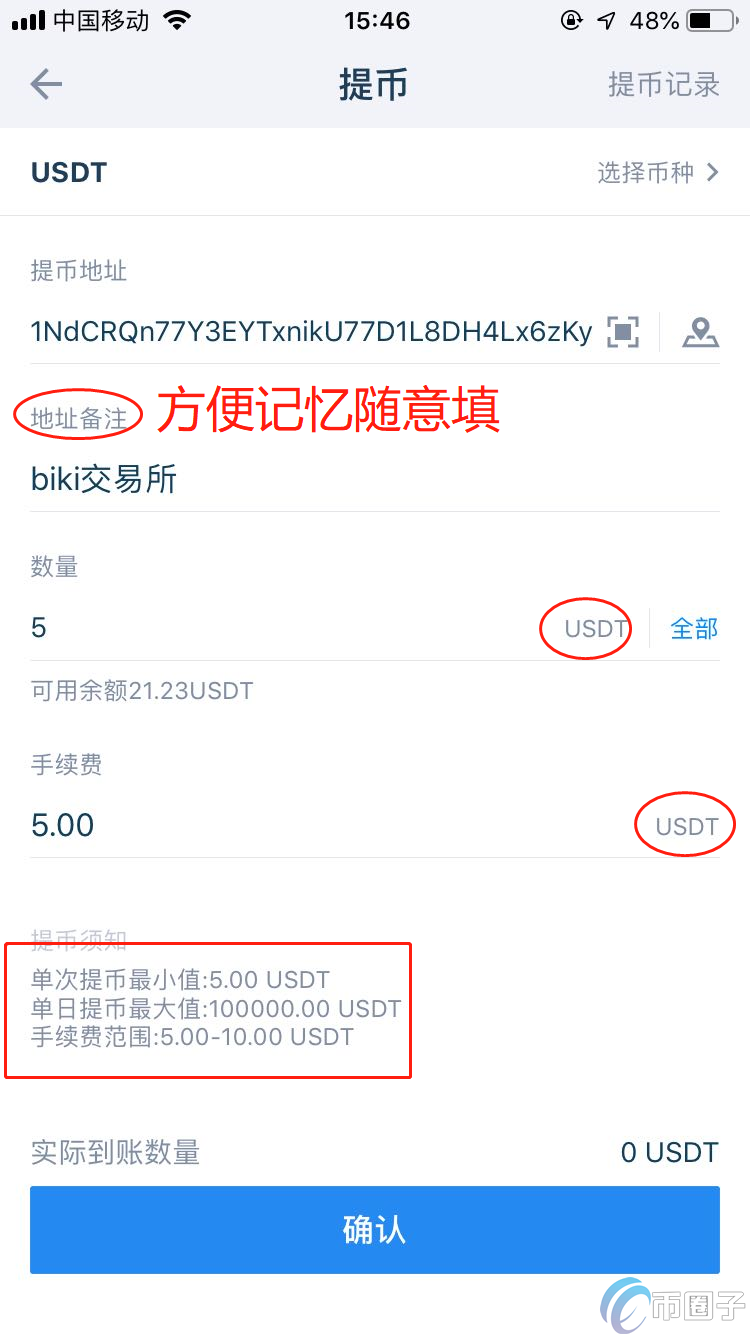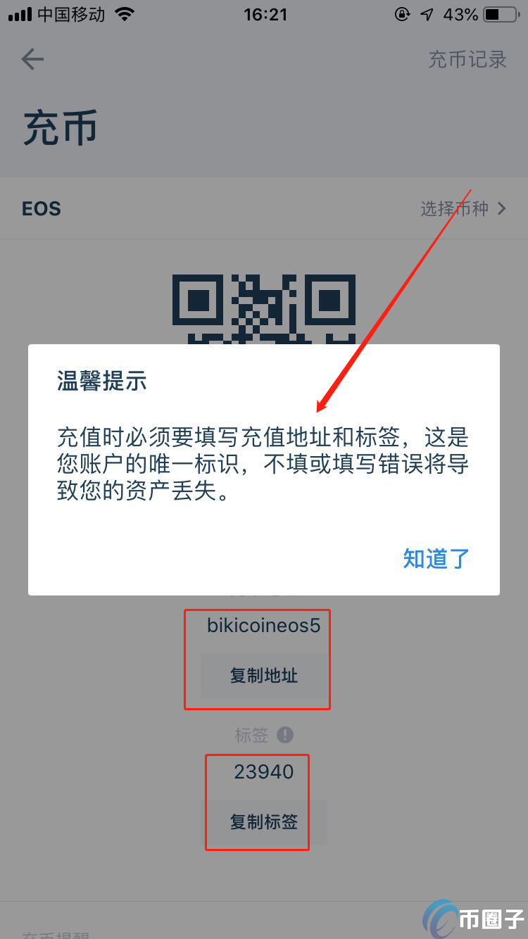 第四步:对于个别币种,如EOS,GPEI,BTS,XRP等个别币种需要添加正确的标签才能到账,否则丢失将无法找回。